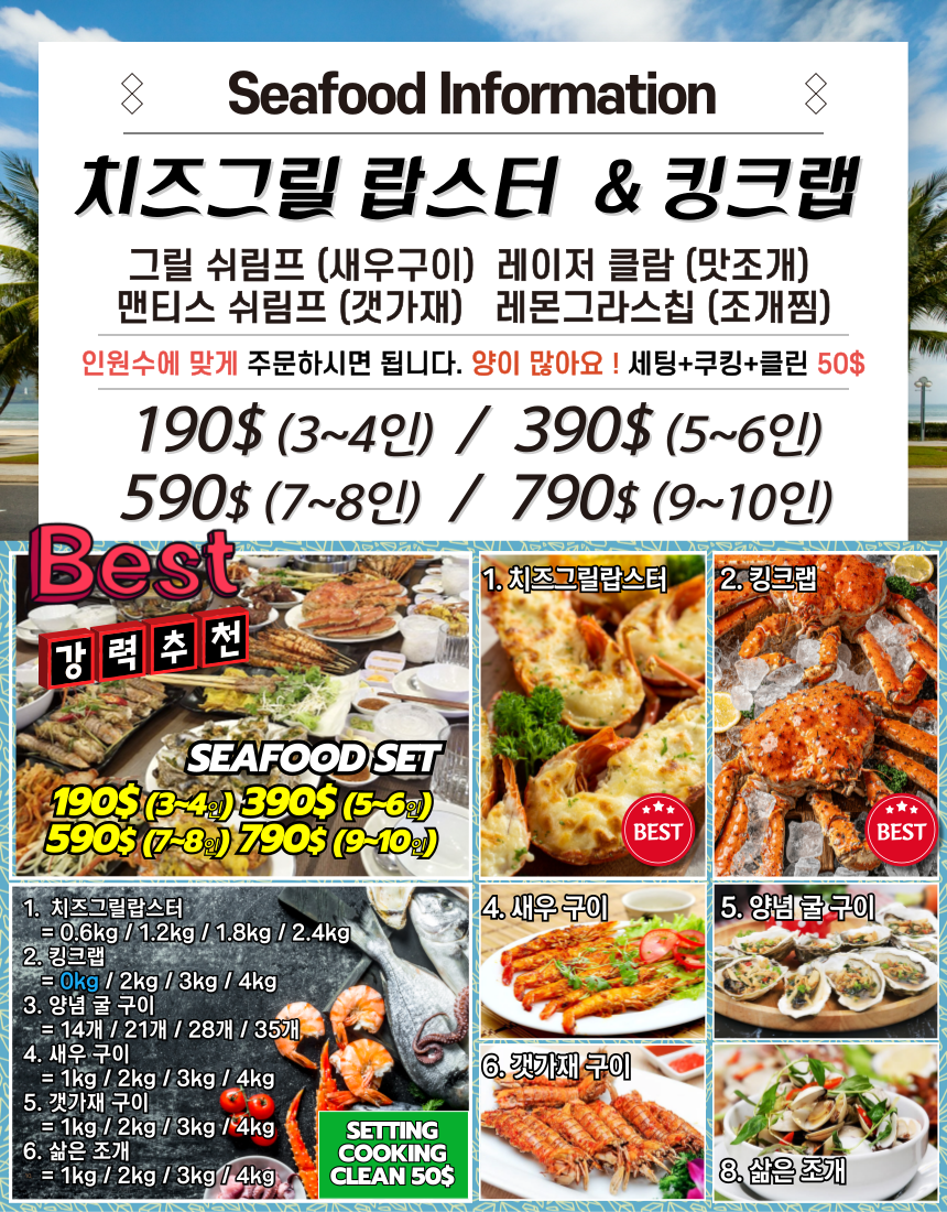 구성: 치즈그릴 랍스터, 킹크랩, 양념굴구이, 새우구이, 갯가재구이, 삶은조개 포함